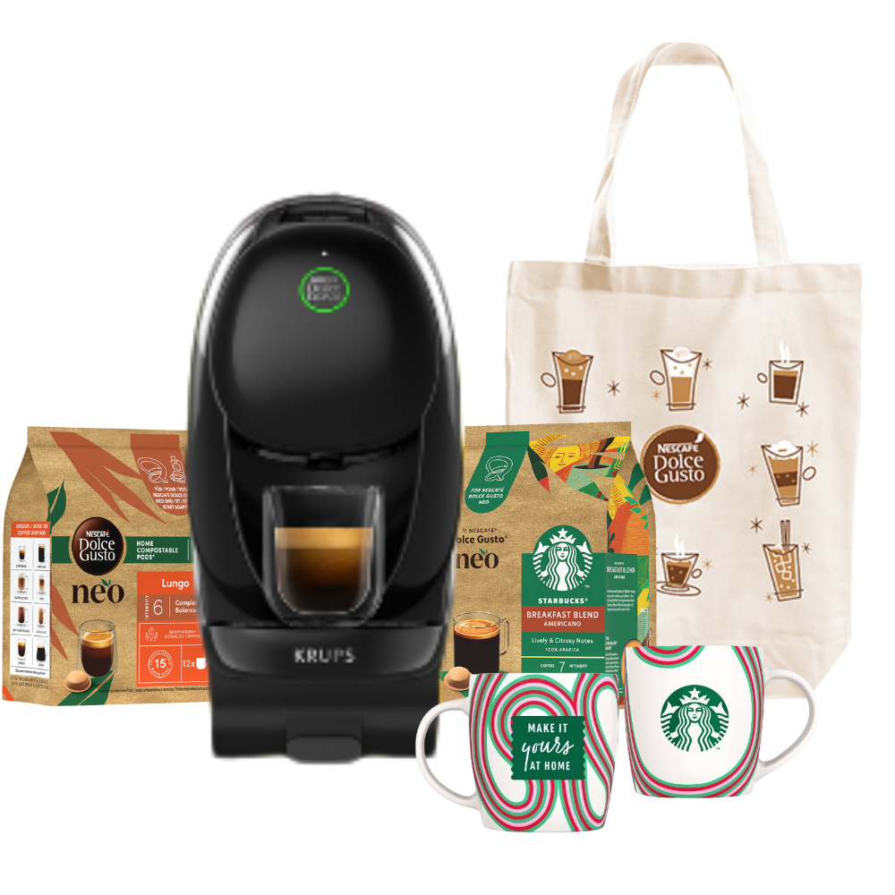Fan van zwarte koffie? Wacht niet langer, we hebben de ideale Gifting set voor jou! Geniet van de heerlijke NEO Lungo en de uitstekende NEO Starbucks® Breakfast Blend Americano in geweldige exclusieve Starbucks®-mokken! Ontvang als extra verrassing een NESCAFÉ Dolce Gusto tote bag!